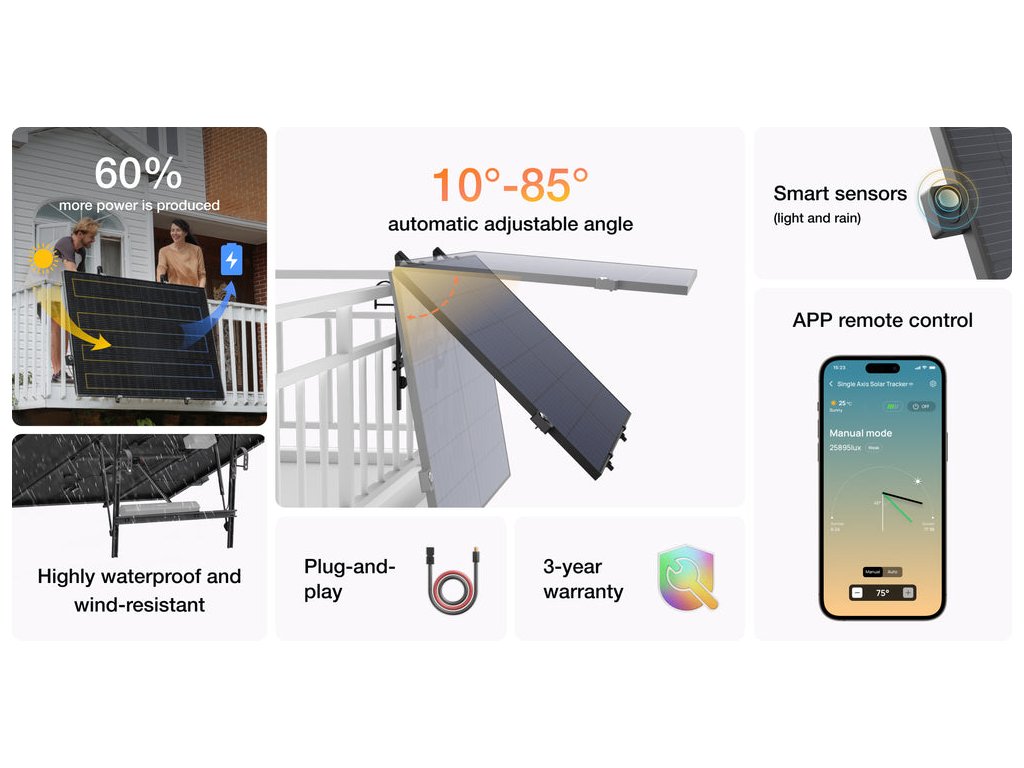 Automaticky se zapíná a funguje po celý den a vypíná se, když slunce zapadne nebo je v nedohlednu. Prostřednictvím aplikace EcoFlow můžete snadno sledovat provozní stav solárního trackeru. Za určitých okolností můžete ručně upravit úhel trackeru. Je vysoce efektivní, inteligentní a bezpečné použití.