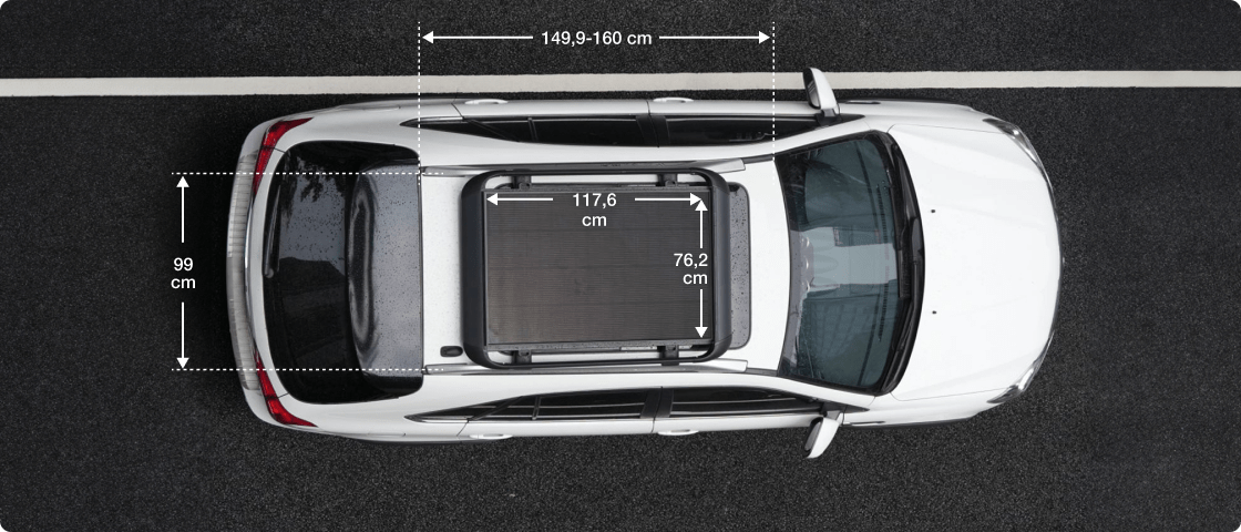 Má perfektní rozměry pro instalaci na střechu SUV o rozměrech 149,9-160 cm × 99 cm, čímž optimalizuje plochu pro generování solární energie.