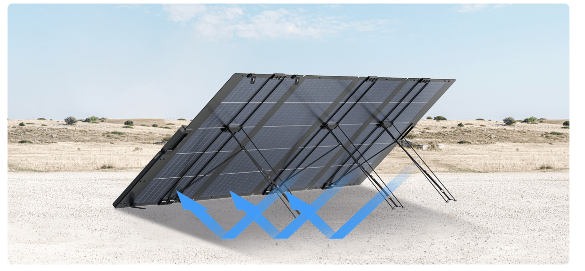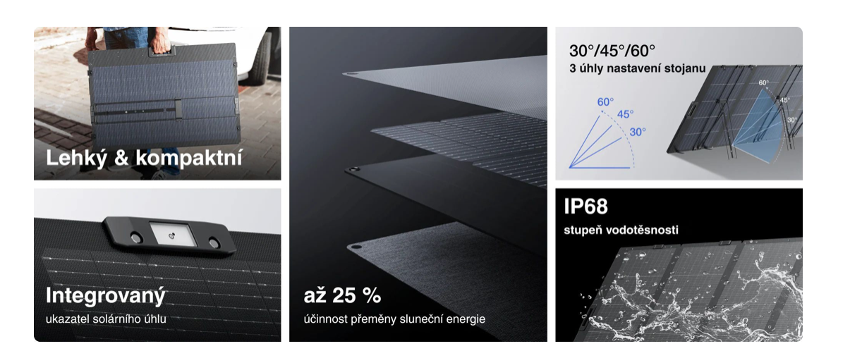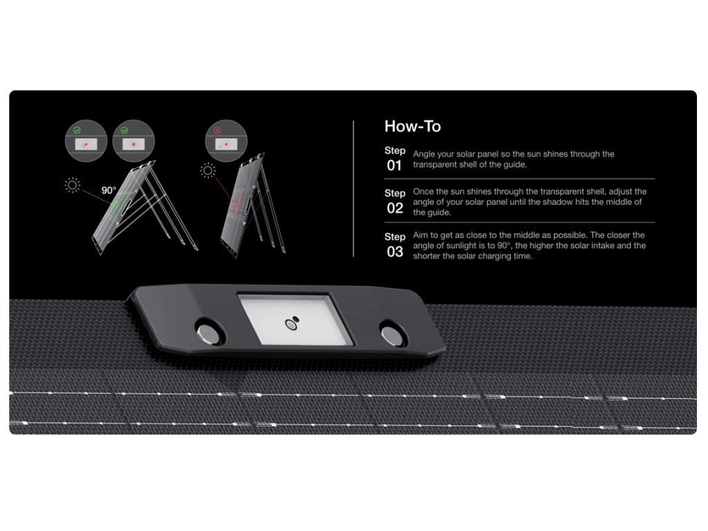 Svou konstrukcí přináší tento panel další možnosti, jak získat maximum energie ze slunečního záření. Obsahuje totiž vestavěný ukazatel úhlu dopadu slunečních paprsků a integrovaný stojan, kterým ho lze naklápět podle aktuální pozice slunce. Je možné ho snadno připojit například k bateriové stanici EcoFlow a maximálně využít energii slunečních dnů.