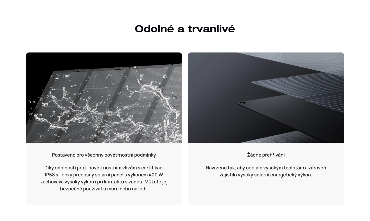 EcoFlow 400W oboustranný skládací solární panel 2. generace využívá pokročilou technologii solárních článků s vysokou účinností, která dosahuje až 25 %. Oproti svým předchůdcům disponuje odlehčenou konstrukcí a celkově vyšší efektivitou přeměny sluneční energie. Jeho vysoká odolnost a zároveň nízké nároky na údržbu z panelu dělají optimální zdroj napájení při aktivitách mimo dosah elektrické sítě.